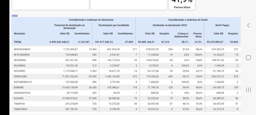 E se você não acredita, veja a relação que a Rota do Turismo conseguiu com exclusividade, sobre quanto Sertaozinho poderia ter destinado 2025 para as entidaes assistenciais, apenas com o imposto de renda das pessoas físicas, no total de R$ 7.122.405,57.
